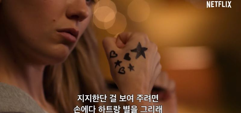 루시가 손등에 하트와 별을 그리는 장면. 사진 넷플릭스 공식 예고편