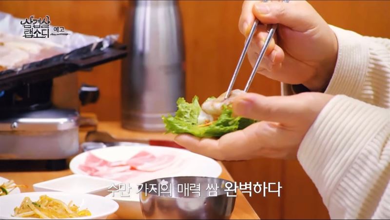 노릇하게 익은 돼지고기에 파절임, 마늘 등 구미를 당기는 다양한 반찬을 곁들여 쌈 채소와 함께 먹는 장면은 그 향과 맛을 이미 익히 알기에 침이 잔뜩 고인다.