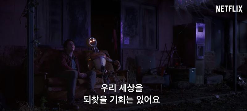 조엘이 로봇 메이비스와 이야기하는 장면. <러브 앤 몬스터스>. 사진 넷플릭스 유튜브 캡처