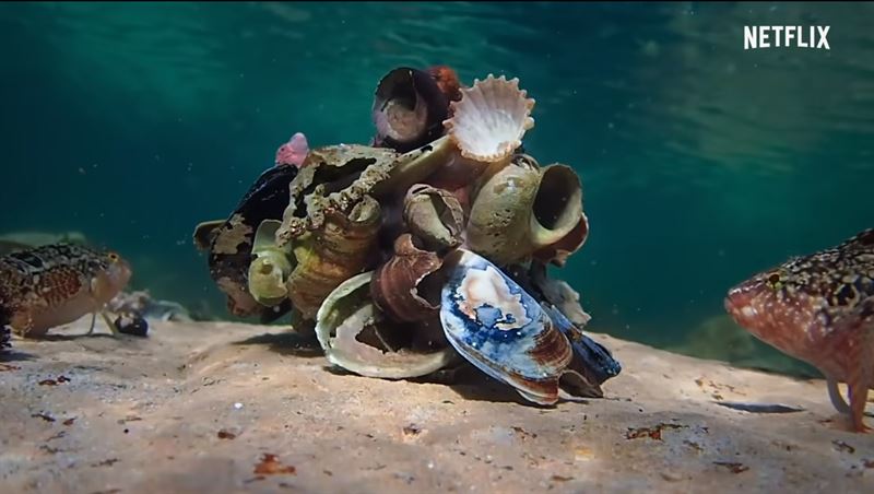 소라와 조개껍데기로 위장한 문어. 사진 넷플릭스 유튜브 캡처