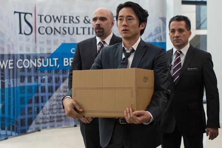 짐을 챙겨 회사를 나서려는 데릭(스티븐 연 분). 사진 다음 영화