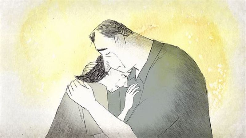 부부가 끌어안고 눈물을 흘릴 때 배경은 노랑이다. 딸과 여행하며 마주한 석양의 금빛과 같다.