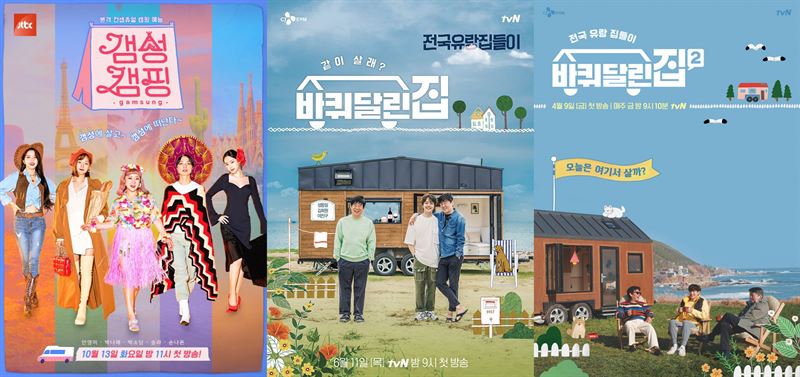 (왼쪽부터) <갬성 캠핑>, <바퀴달린 집>, <바퀴달린 집2> 공식 포스터. 사진 JTBC 갬성캠핑, tvN 바퀴달린 집 공식홈