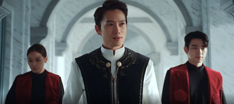 시범재판부의 재판장 요한(가운데)과 배석판사들. 사진 티빙 캡처