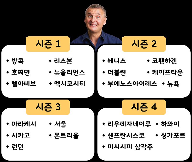 4개의 시즌 동안 필 아저씨가 방문한 도시는 총 22개이며, 에피소드마다 소개된 음식의 개수는 무궁무진하다.