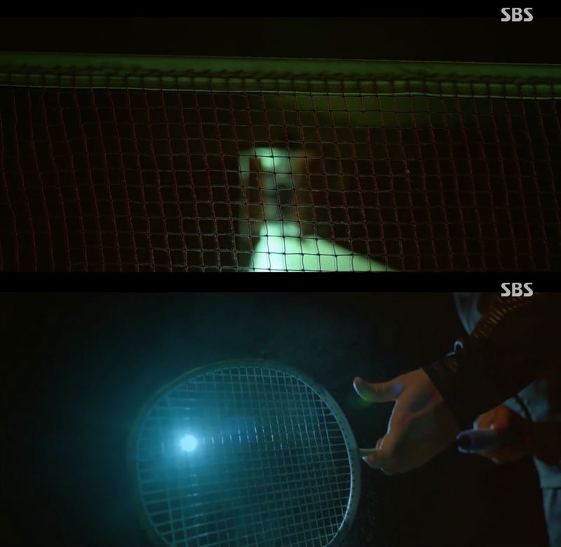 네트 사이로 보이는 문틈 사이의 빛. 배드민턴 라켓 사이로 보이는 핀 조명, 그리고 라켓에서 일어나는 먼지 묘사까지.