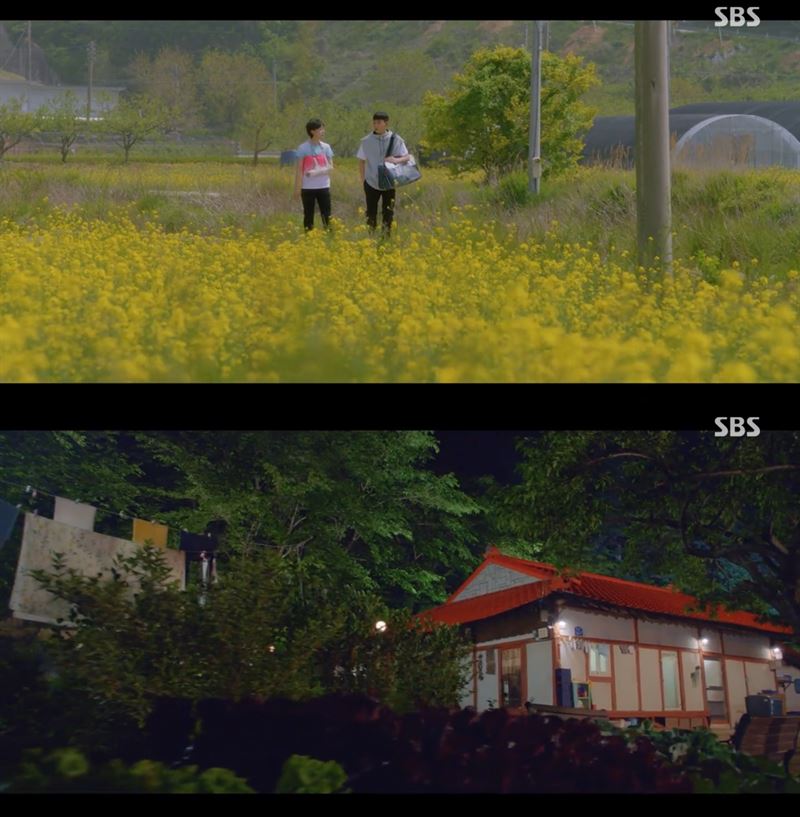 (위)유채꽃밭을 걷고 있는 세윤과 해강 (아래)해강이의 집. 사진 WAVVE 캡처