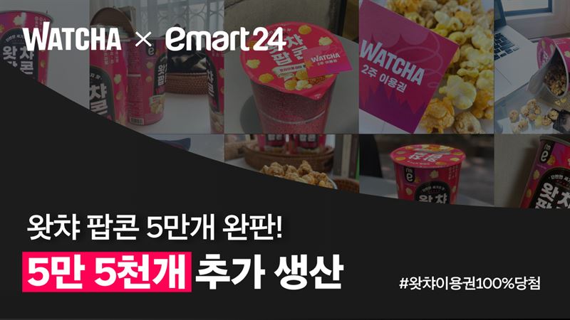 왓챠와 이마트24는 지난 6월 왓챠 이용권이 담긴 왓챠팝콘을 출시했으며, 한 달 만에 1차 생산량인 5만개가 완판되면서 2차로 5만5천개 추가 생산에 들어갔다. 추가로 생산되는 제품에는 1년 이용권인 골든티켓을 추가해 구매자 혜택을 더욱 높였으며, 오는 12일부터 전국 이마트24 매장에서 판매를 시작한다.