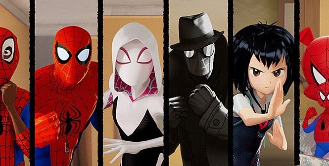 개성 강한 평행 세계의 스파이더맨들. 왼쪽 부터 페니 파커, 그웬 스테이시, 피터 포커, 마일즈 모랄레스, 피터 파커, 피터 파커(느와르)이다. 사진 네이버 영화 스틸컷