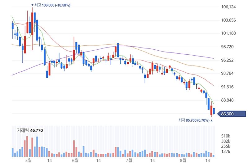 8월 19일 기준 스튜디오드래곤 차트 캡쳐 (네이버 주식 서비스)