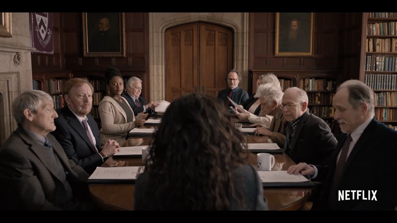 회의를 진행하는 지윤과 영문학과 교수들. 사진 넷플릭스 예고편 캡처