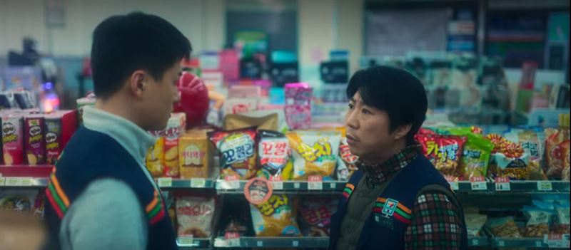편의점 점주는 아르바이트생 황장수 병장(신승호 분)에게 "유통기한 지났다고 바로 치우면 적자 나는 건 네가 메꿀 거야, 어?"라며 가슴팍을 치고, "다시 채워놔"라고 지시한다. 두 사람이 입은 조끼에는 세븐일레븐 로고가 선명하게 보인다.