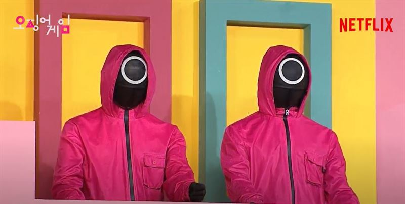 특히 분홍색 점프 수트를 입고 가면으로 얼굴을 가린 '가면남'들이 함께 했는데, 가면남은 드라마 속 게임을 주최하고 진행하는 모든 이들을 통칭하는 표현이다.