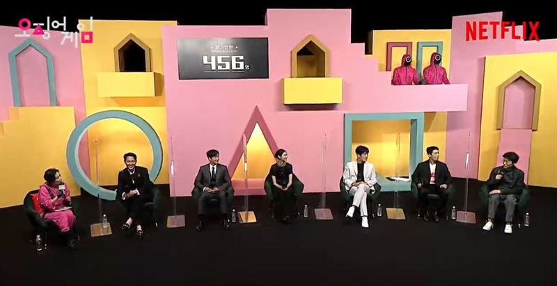 <오징어게임>이 인생을 걸고 게임에 참여한 사람들의 생존기를 다룬 드라마인 만큼, 제작발표회도 '게임'이라는 콘셉트로 핑크빛으로 꾸며진 공간에서 이뤄졌다.