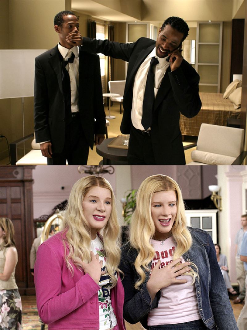 <화이트 칙스> 영화 중 한 장면. 케빈 코플랜드와 마커스 코플랜드 요원의 모습(위). 케빈 코플랜드와 마커스 코플랜드 요원이 여장한 모습(아래). 사진 다음 영화