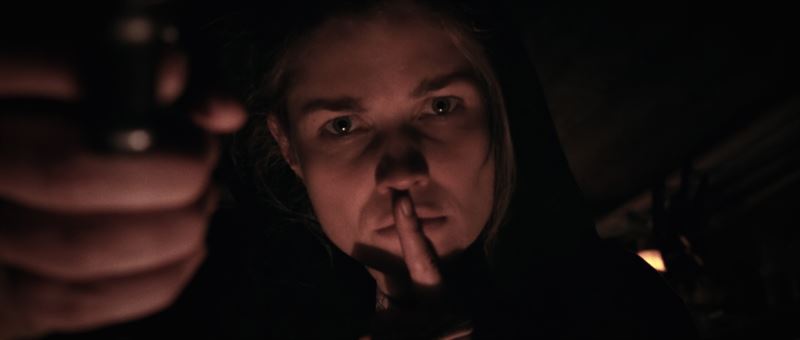 목소리를 감지하도록 프로그래밍이 된 로봇을 피하기 위해 인물들은 항상 침묵해야 한다. 사진 다음 영화