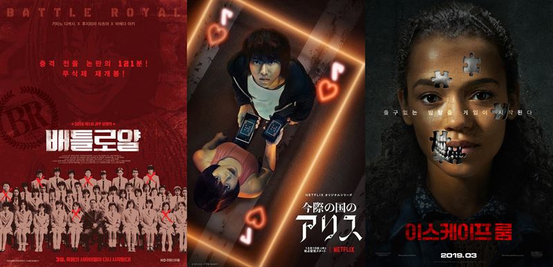 왼쪽부터 드라마 <배틀로얄>, <아리스 인 보더랜드>, <이스케이프 룸>의 공식 포스터. 사진 각 다음 영화, 넷플릭스
