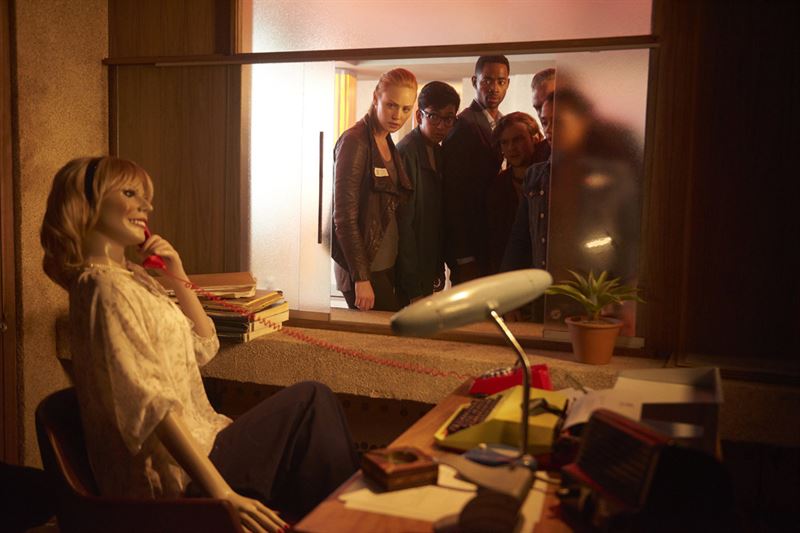 대기실이 이미 방탈출 게임 방이었다는 사실을 알게 되는 참가자 6인. 사진 다음 영화