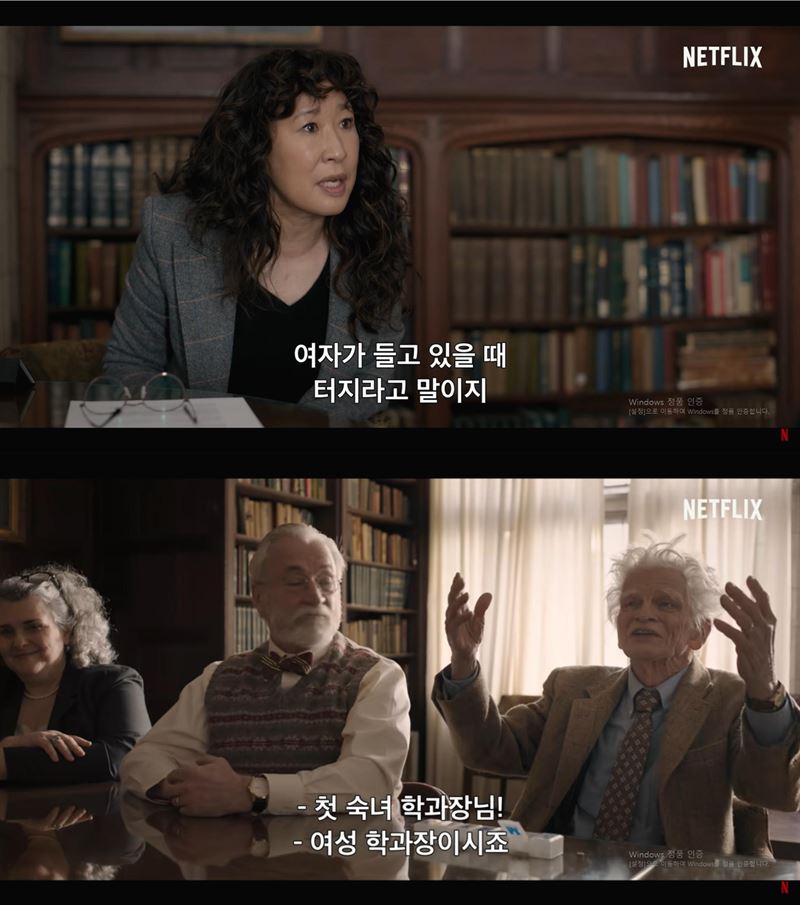 <더 체어>의 지윤(산드라 오)과 교수진들. 사진 넷플릭스 유튜브 공식채널 캡처