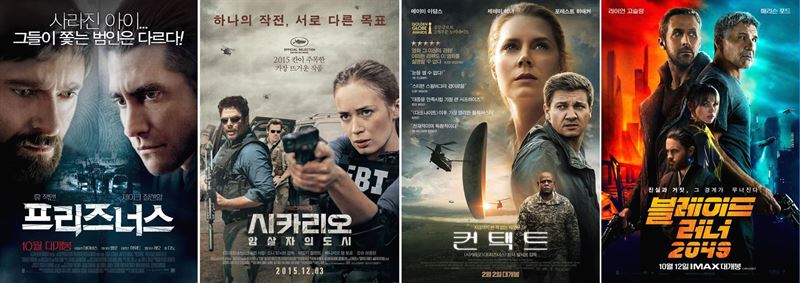 개봉 순서대로 <프리즈너스>, <시카리오: 암살자의 도시>, <컨택트>, <블레이드 러너 2049> 포스터. 사진 다음 영화