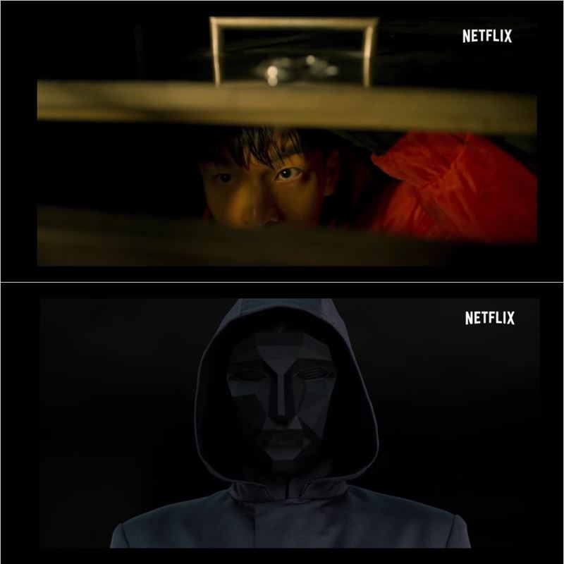 준호(위)와 프론트맨(아래). 주최 측을 쫓는 준호 캐릭터는 데스 게임 장르에서 새로운 서사를 만들었다. 사진 유튜브 캡처