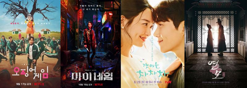 왼쪽부터 차례로 <오징어 게임>, <마이 네임>, <갯마을 차차차>, <연모> 공식 포스터. 사진 각 넷플릭스, 티빙, KBS2