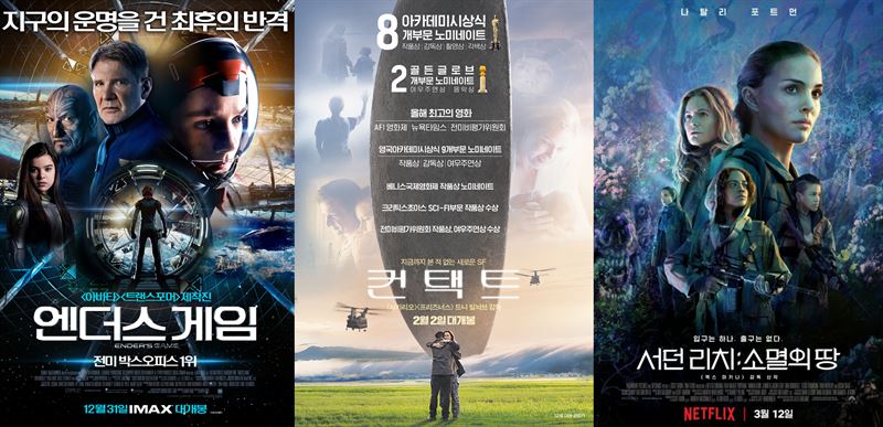 왼쪽부터 <엔더스 게임>, <컨택트>, <서던 리치: 소멸의 땅> 공식 포스터. 사진 다음 영화, 넷플릭스