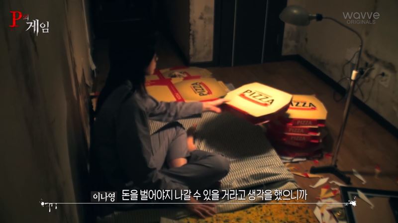 탈락자 이나영은 위로 올라갈 돈을 벌기 위해 피자 박스를 접는다. 사진 웨이브 캡처