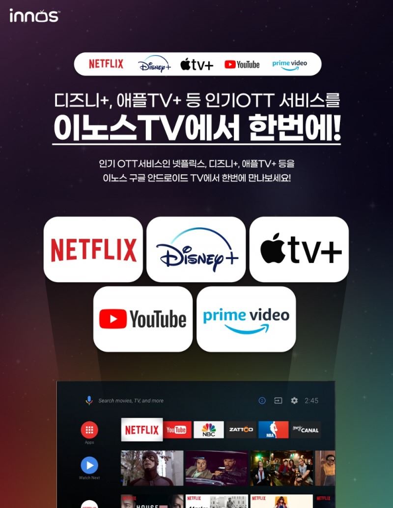 TV 브랜드 이노스 TV가 자사 안드로이드 TV 전 제품에 '디즈니플러스'와 '애플TV플러스'를 업데이트 지원한다.