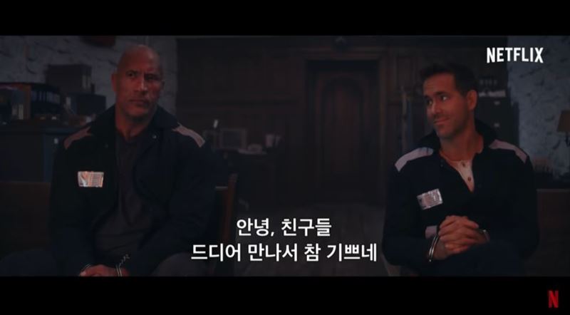 나란히 앉아 있는 존 하틀리(드웨인 존슨 분)와 놀런 부스(라이언 레이놀즈 분). 사진 넷플릭스 코리아 유튜브 캡처