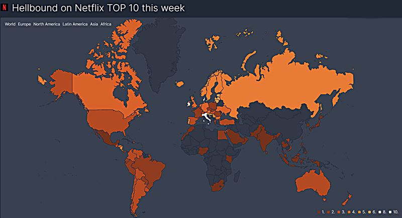 '지옥'이 공개된후 OTT 콘텐츠 순위 집계 사이트인 플릭스 패트롤 지옥 시청률 집계 지도를 보면 상당 수 국가에서 시청률 상위권을 차지하고 있는 것을 알 수 있다.