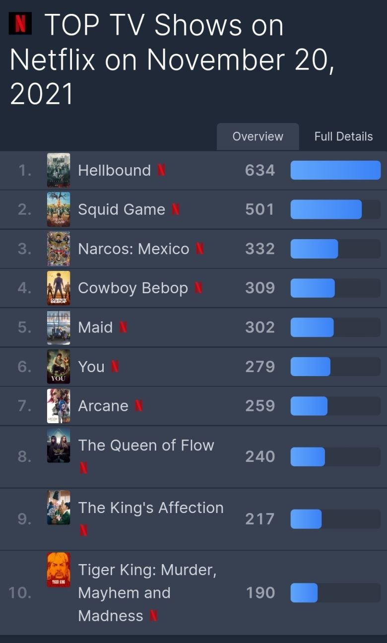 지난 20일 기준 지옥은 넷플릭스가 서비스하는 나라중 62개국에서 시청률 3위 안에 들었고, 29개국에서는 1위를 차지했다.