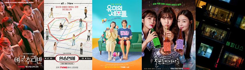 왼쪽부터 <여고추리반>, <환승연애>, <유미의 세포들>, <술꾼도시여자들>, <해피니스> 공식 포스터. 사진 티빙