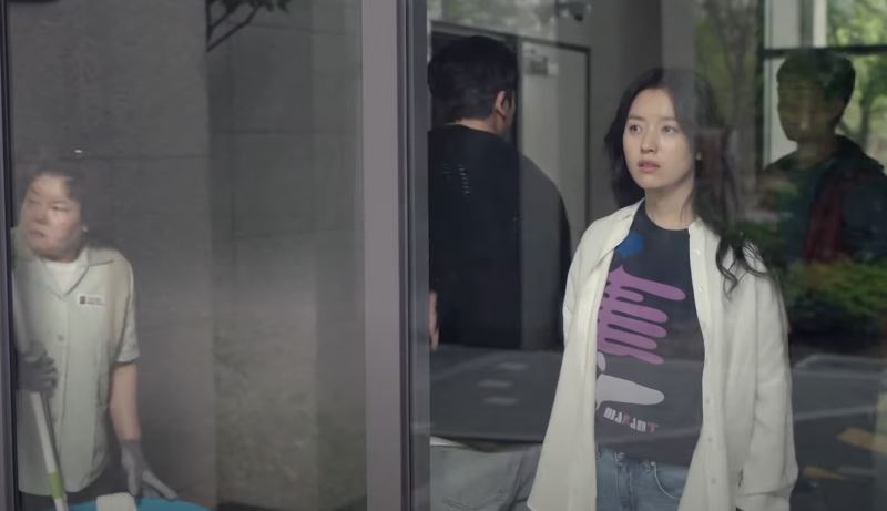 감염병으로 인해 아파트에 통제된 주민들과 윤새봄(한효주 분). 사진 티빙 유튜브 캡처