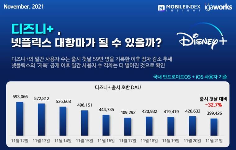 모바일인덱스가 지난 26일 발표한 '디즈니플러스, 넷플릭스 대항마가 될 수 있을까?' 자료에서 디즈니플러스 일간 사용자 수가 열흘 만에 32.7% 감소한 것으로 나타났다.