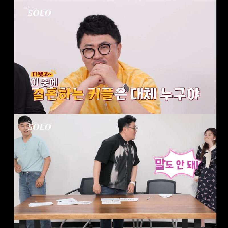 1기 결혼 커플의 정체를 보고 놀라는 MC들(아래). 어떤 커플이 결혼에 골인할지 유추하며 보는 재미가 있다. 사진 웨이브 캡처