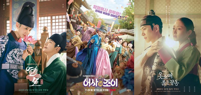 왼쪽부터 <연모>, <어사와 조이>, <옷소매 붉은 끝동> 공식 포스터. 사진 KBS, 티빙, MBC