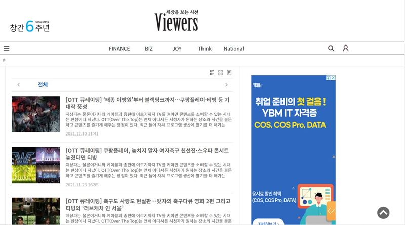뷰어스는 지난 10월부터 박진희 부장이 [OTT 큐레이팅]이라는 코너명으로 매월 2~4회 OTT 콘텐츠 소식을 전하고 있다.