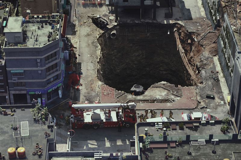 땅 꺼짐 현상(싱크홀)으로 건물이 땅 밑으로 매몰되고 지반에 구멍이 난 모습. 사진 다음 영화