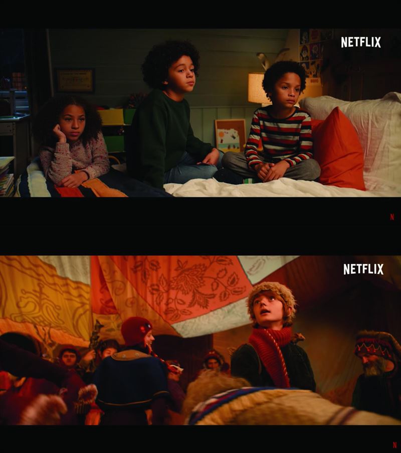 <크리스마스로 불리는 소년>의 세 남매(위)와 니콜라스(아래). 사진 넷플릭스 공식 유튜브 캡처