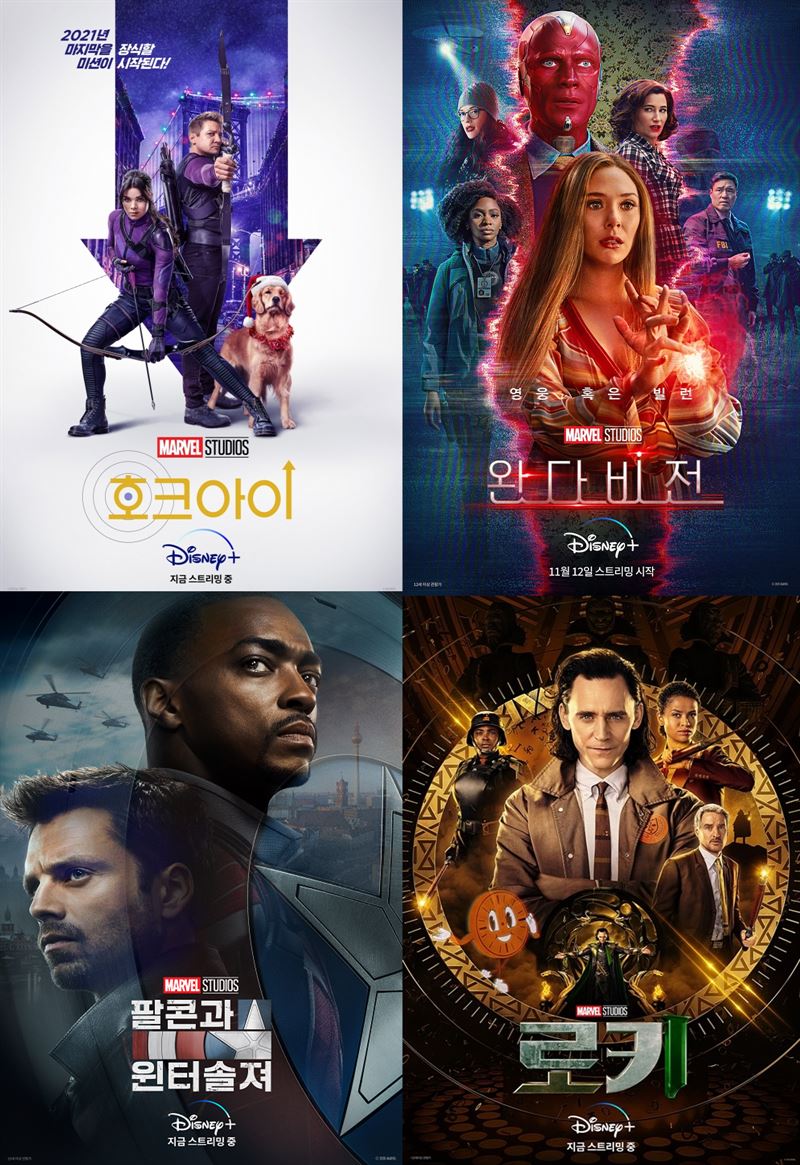 <호크아이>, <완다비전>, <팔콘과 윈터솔져>, <로키> 공식 포스터. 사진 월트디즈니컴퍼니