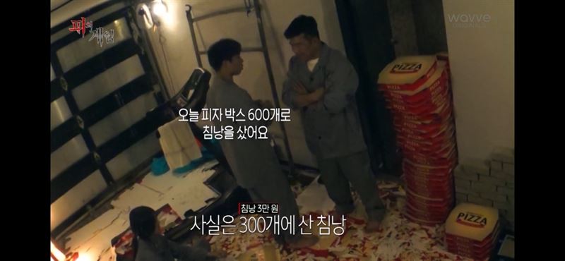 탈락한 플레이어들은 지하층에서 피자박스를 접으며 지상층으로 올라갈 기회를 노린다. 사진 웨이브 캡처