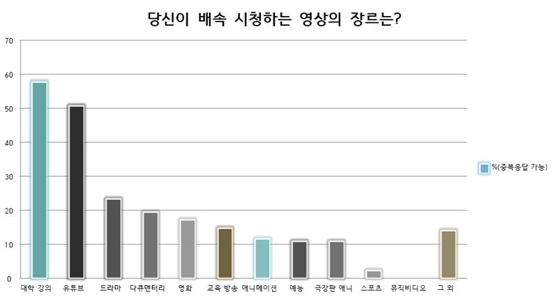 그렇다면 그들은 어떤 영상을 주로 배속 시청할까? 가장 높은 응답을 보인 것은 '강의 동영상'이다. 코로나19 팬데믹으로 비대면 수업이 증가한 가운데 녹화 수업은 가차없이 배속 시청 당한다. 그 이유는 '효율적인 수업을 듣기 위해서'가 많았다.