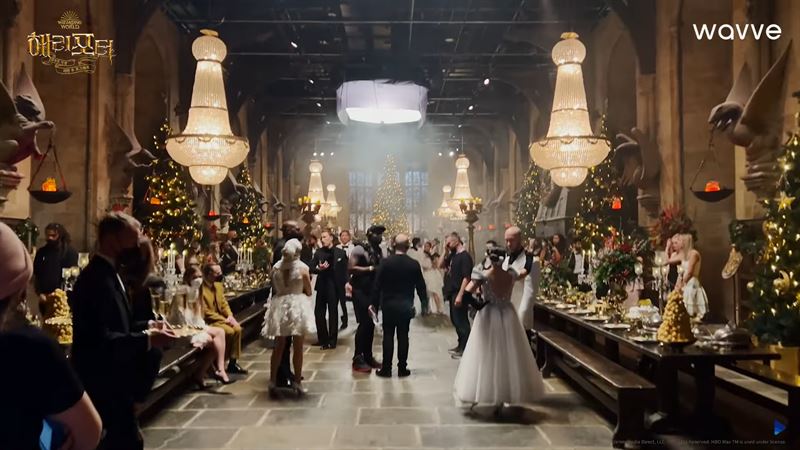 호그와트 그레이트홀 속 연회를 준비하는 제작진들과 출연자들의 모습. 사진 웨이브 공식 유튜브 캡처