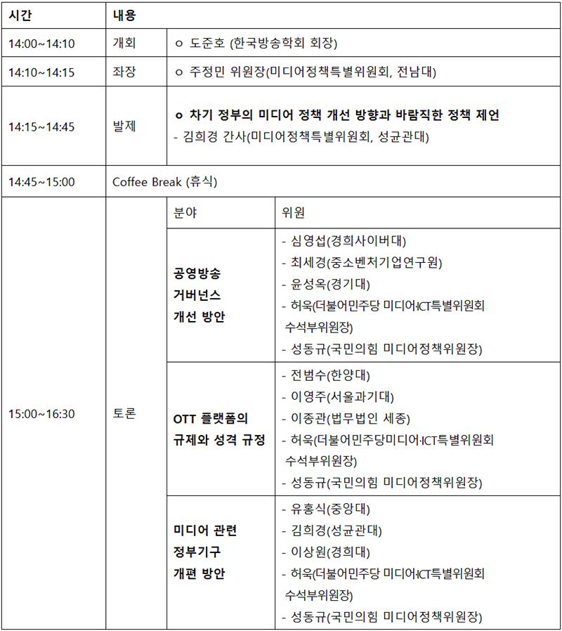 한국방송학회(회장 도준호) 오는 2월 18일(금) 한국프레스센터에서 <차기 정부의 미디어 정책 개선 방향과 바람직한 정책 제언>을 주제로 토론회를 개최한다.