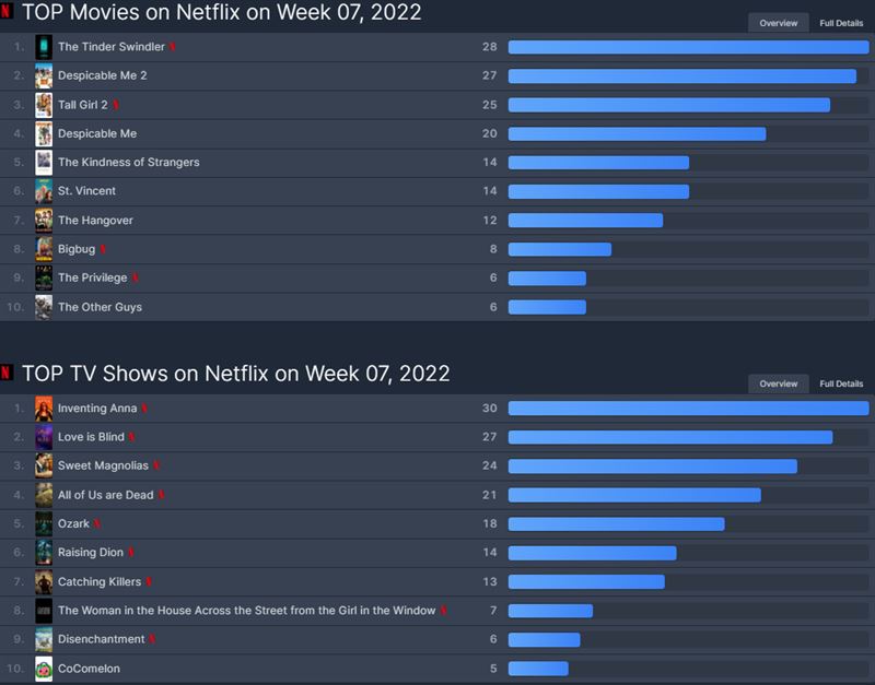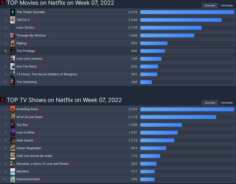 넷플릭스 전 세계 영화 시청 순위 1위는 <데이트 앱 사기: 당신을 노린다>가 2주 연속 차지했다.