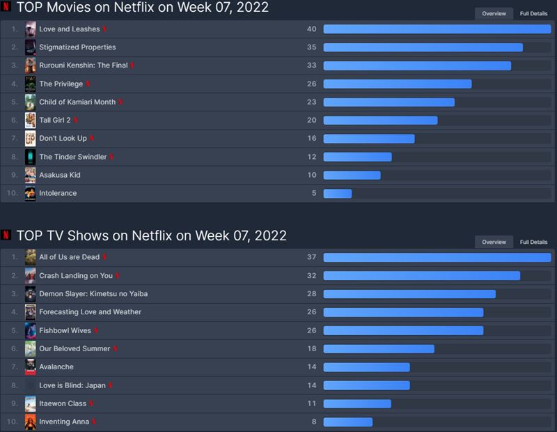 일본 애니메이션 대신에 5위 <금붕어 아내>, 7위 <아발란치>, 8위 <연애 실험: 블라인드 러브 일본편> 등 TOP 10 차트에서 쉽게 볼 수 없었던 일본 드라마가 랭크인됐다.