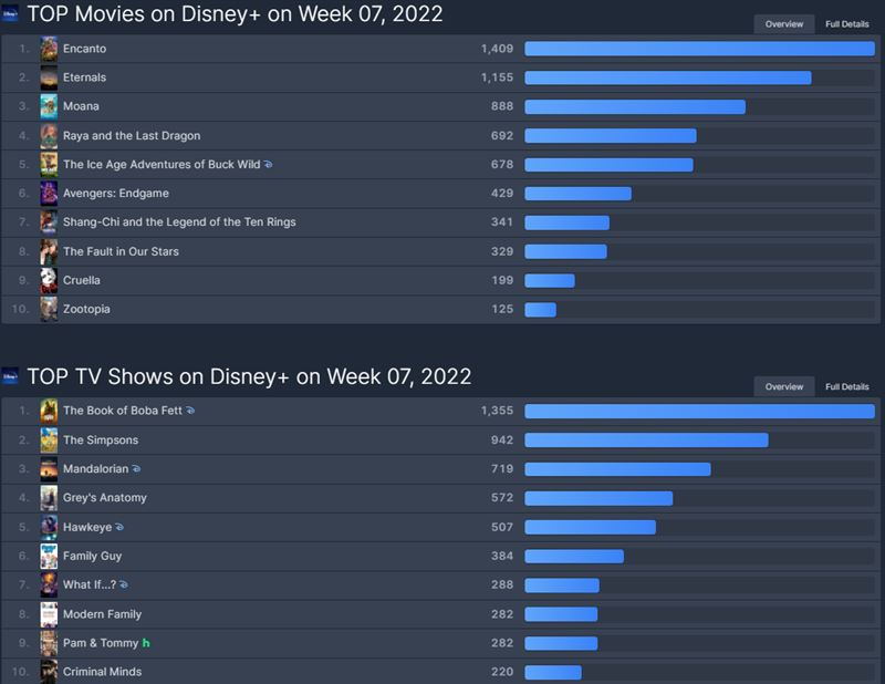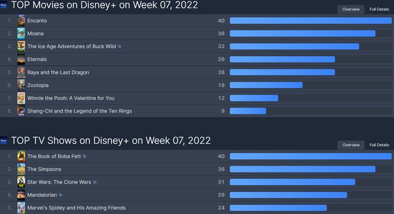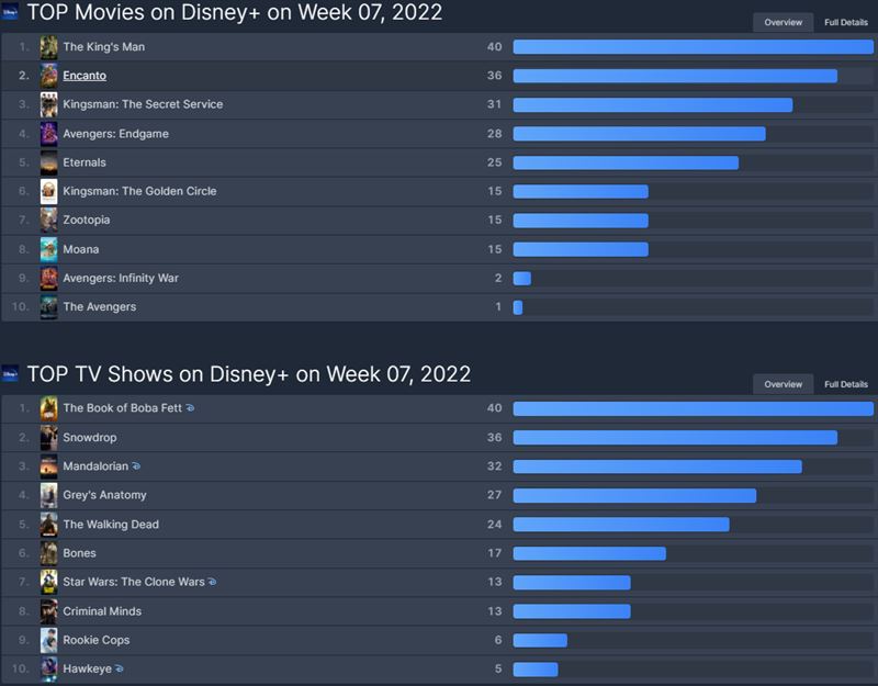 디즈니플러스 전 세계 영화 순위는 <엔칸토>가 4주 연속 1위를 차지했다. 이터널스 역시 4주 연속 2위를 기록했다.