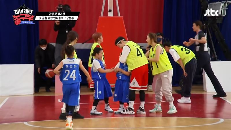 유소녀 농구클럽과 평가전을 치르는 출연진들(사진=JTBC 유튜브 캡처).