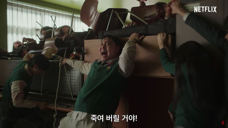 음악실 책상과 도구를 이용해 좀비를 막는 아이들(사진=넷플릭스 유튜브 캡처).